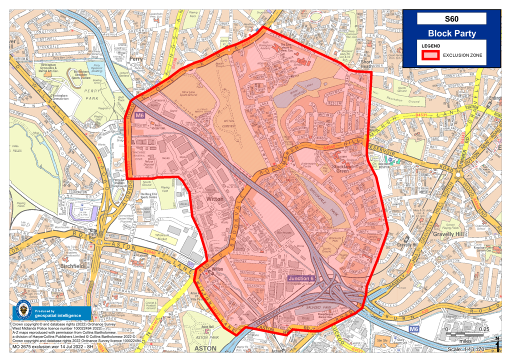 In the last few weeks, there have been a number of serious violent incidents in and around the Wyrley Birch Estate, Kingstanding. These offences have involved the use of knives, machetes and suspected firearms. In addition to this, intelligence suggests that a Block Party, with known OCG nominals attending, will take place in Erdington on Saturday 16th June 2022 at Faulkners Farm Drive, Erdington. It is suggested that OCG nominals will attend the location with firearms and weapons. Previous such parties in Erdington have attracted hundreds of attendees, with the most recent large party (2019) seeing a firearms discharge. Birmingham West and Birmingham East have had a number of recent violent offences involving weapons, knives and firearms incidents, therefore a section 60 is required to maximise opportunities to prevent serious harm. The location is the Wyrley Birch Area in Kingstanding and the outskirts as well as all arterial routes to the location, to prevent serious injury and disorder on the Estate. There was intelligence that a Block party would take place on 1st July but this did not take place and intelligence suggests that it was postponed to either the 15th or 16th July. |