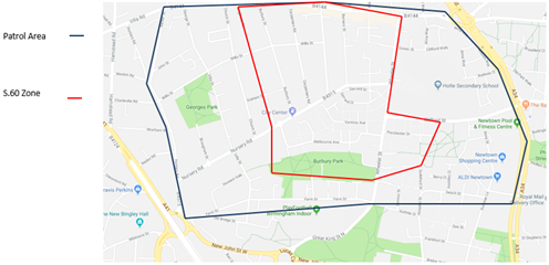 Section 60 authorised in Lozells, for the same geography as the previous evening, during which a further stabbing occurred. This s60 is following a series of offences involving up to 11 males who have been entering local stores and threatening the shopkeepers with knives (involving one victim being stabbed) and a number of street robberies (where three victims have been stabbed). The s60 was active from 1400 hrs on 8th March 2018 to 0200 hrs on 9th March 2018 and officers were deployed into that area accordingly.