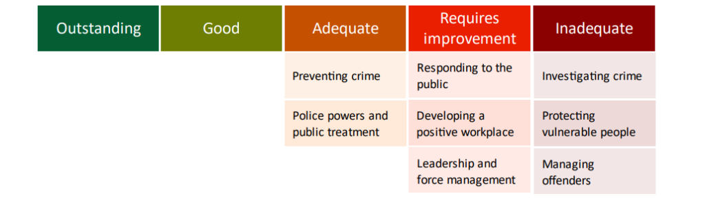 In PEEL 2023-25, HMICFRS graded West Midlands Police’s performance across 8 areas of policing and found the force was ‘adequate’ in two areas, ‘requires improvement’ in three areas, and ‘inadequate’ in three areas. HMICFRS highlighted the inadequate areas as how the force investigates crime, how it manages offenders and how it protects vulnerable people.